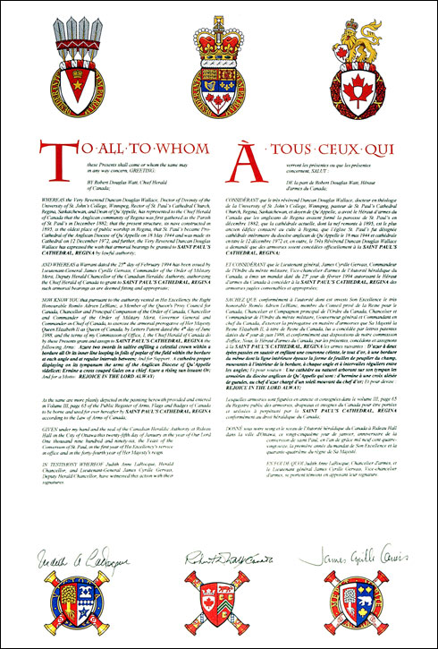 Additional InformationCreator(s)Original concept of Saint-Paul's Cathedral and Robert Black, assisted by the Heralds of the Canadian Heraldic Authority PainterLinda Nicholson CalligrapherSuzzann Wright Recipient TypeCivil Institution