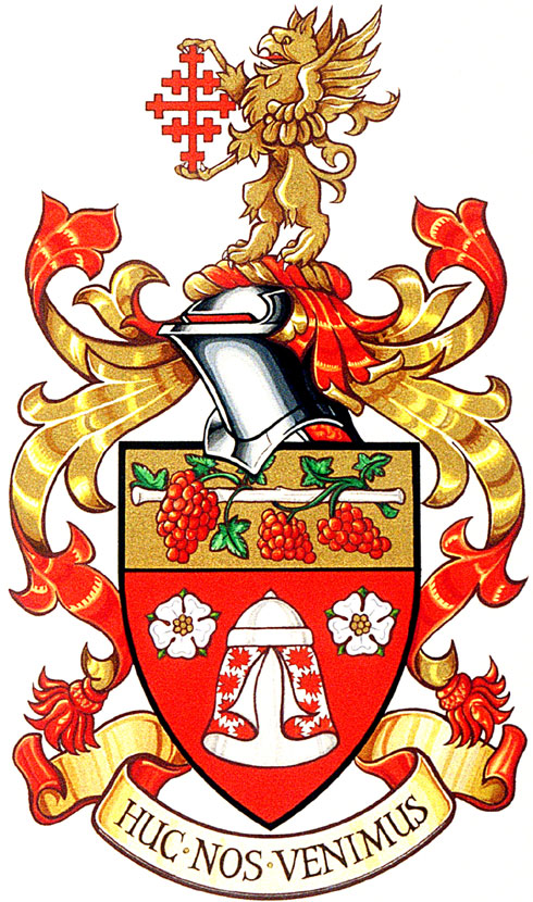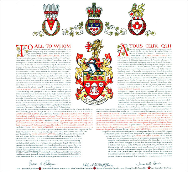 Arms of John Vincent LawerBlazonGules between two roses Argent barbed and seeded proper a sperver draped Argent semé of maple leaves Gules domed and doubled Argent on a chief Or a staff fesswise proper entwined of a grape vine Vert fructed Gules; SymbolismThe red and white colours honour Canada and the City of London, the birthplace of Mr. Lawer’s father, and of which Mr. Lawer is a Freeman. The staff and grapes contain a multitude of meanings based on the German spelling of Mr. Lawer’s name. “Lauer” means to “spy out and observe keenly” and also “wine of the second press”. This charge thus alludes to the story of Moses sending spies into Canaan, who then returned with a branch of grapes carried on a staff by two men to show the Israelites the bounty of the land. The Yorkshire roses pay tribute to the Sheffield birthplace of Mr. Lawer’s maternal grandfather. The pavilion is a reference to Mr. Lawer’s status as a liveryman in the Worshipful Company of Upholders of London, as it appears in the 1465 arms of this organization. It is made distinct to Mr. Lawer with the maple leaves honouring Canada. |