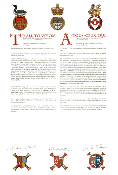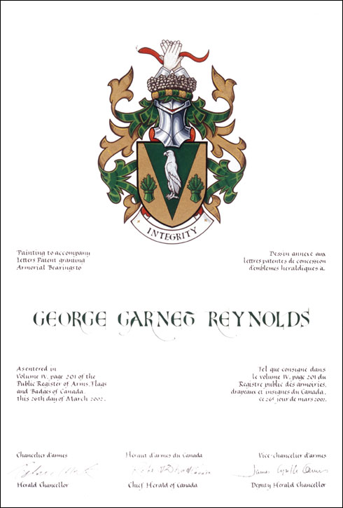 Arms of George Garnet ReynoldsBlazonOr on a pile between two garbs Vert a falcon close Argent; SymbolismThe gold and green allude to Saskatchewan, Dr. Reynolds’ birthplace. The green triangular shape represents the Alberni Valley, British Columbia, his home for over 50 years, and also his Irish ancestors. The white falcon is a symbol of his Icelandic forebears. |