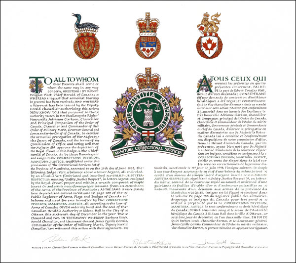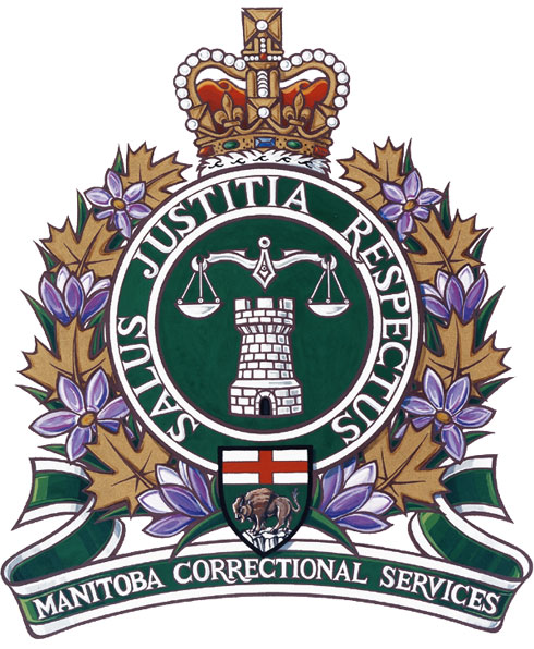 Badge of the Corrections Division, Manitoba JusticeBlazonVert a balance above a tower Argent, all encircled by an annulus Vert fimbriated and inscribed SALUS JUSTITIA RESPECTUS in letters Argent, ensigned by the Royal Crown proper and within a wreath composed of maple leaves Or and prairie crocus flowers proper issuant from an escutcheon of the Arms of the Province of Manitoba; SymbolismThe badge is based on the general structure of other badges used by law enforcement agencies in Canada. The tower represents the work of the Corrections Division, and the balance refers to the idea of justice. The outer elements of the maple leaves, prairie crocuses, the arms of Manitoba, and the Royal Crown indicate that the Corrections Division works within the context of Canadian and Manitoba law under the authority of the Crown. The Latin phrase meaning “Safety Justice Respect” encapsulates the principles behind the work of the Corrections Division. |