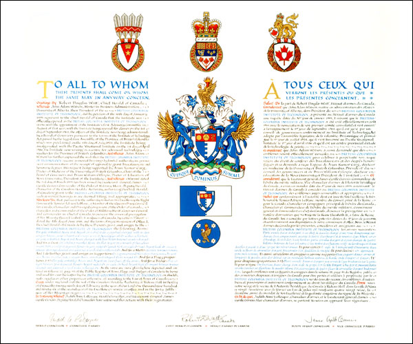 Additional InformationCreator(s)Original concept of Robert D. Watt, Chief Herald of Canada, assisted by the Heralds of the Canadian Heraldic Authority PainterDebra MacGarvie CalligrapherNancy Ellis Recipient TypeCivil Institution