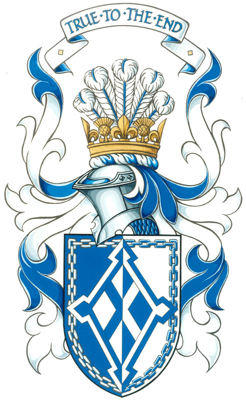 CrestBlazonIssuant from a coronet rim set with fleurs-de-lys and thistles Or five ostrich plumes Argent quilled Azure; |