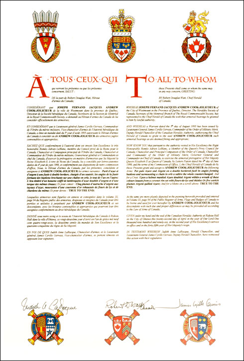 Additional InformationCreator(s)Original concept of Charles Maier, Athabaska Herald, and Leopold Kurcz, assisted by the Heralds of the Canadian Heraldic Authority PainterEva Pilar-Cass CalligrapherJudith Bainbridge Recipient TypeIndividual |