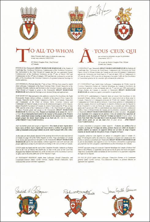 Additional InformationCreator(s)Original concept of Robert D. Watt, Chief Herald of Canada, assisted by the heralds of the Canadian Heraldic Authority. PainterLinda Nicholson CalligrapherNancy Ellis Recipient TypeIndividual Special DesignationTerritorial Commissioner |
