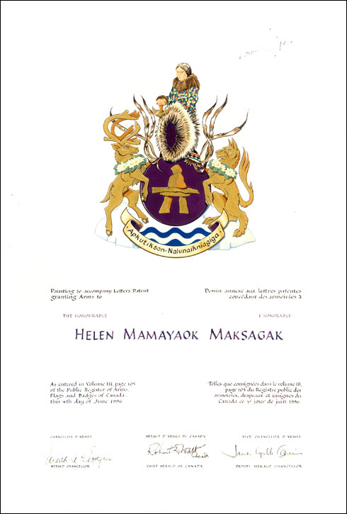 Arms of Helen Mamayaok MaksagakBlazonPurpure an Inukshuk of six stones Or; SymbolismThe colours purple and yellow were chosen by Commissioner Maksagak. The Inukshuk, a directional marker composed of stones used by the Inuit, is composed, in this instance, of six stones, referring to Commissioner Maksagak’s six children. It is used here to emphasize her role in shaping her children’s lives and to convey through a visual message her function as a community leader and as a guide or stable point of reference in a changing world. |