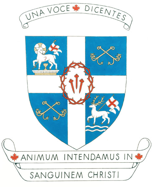 Arms of St. Clement ChurchBlazonAzure on a cross Argent surmounted by a crown of thorns three nails of the Passion Gules the whole between in the first quarter an altar Or and Argent thereon the Agnus Dei proper vulned at the flank droplets Gules dripping into a chalice Or in the fourth quarter a hart Argent armed and unguled Or trippant on two bars wavy Argent bearing as the Agnus Dei a pennant Argent a cross Gules the second and third quarters each displaying two anchors of three flukes in saltire Or; SymbolismThe crown of thorns enclosing three nails is rendered in relief on the face of the main altar of St. Clement Church. The pierced lamb whose blood flows into the chalice is a symbolic representation of the Mass and emphasizes the notion of Mass as sacrifice. The stag and water are taken from a mosaic in the apse of the church of San Clemente in Rome where the stag is depicted drinking from the waters of salvation. The crossed grapnels recall the instrument of martyrdom of Saint Clement, the church’s namesake. The grapnels are also shown here to demonstrate the connection between St. Clement’s, Ottawa and San Clemente, Rome. |