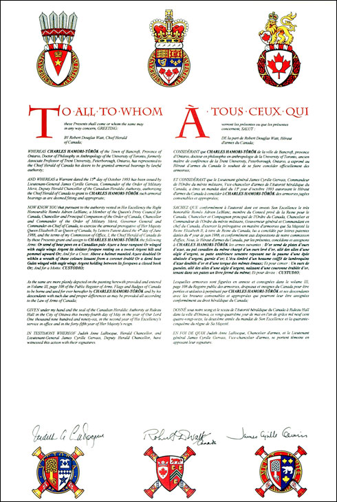 Additional InformationCreator(s)Original concept of Robert D. Watt, Chief Herald of Canada, assisted by the heralds of the Canadian Heraldic Authority. PainterJoan Bouwmeester CalligrapherJoan Bouwmeester Recipient TypeIndividual |