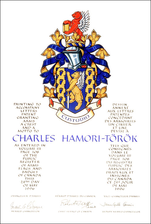 Arms of Charles Hamori-TörökBlazonOr semé of bear paws on a Canadian pale Azure a bear rampant Or winged with eagle wings Argent its sinister forepaw resting on a sword Argent hilt and pommel upward Or; |