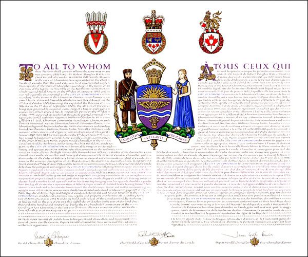 Additional InformationCreator(s)Original concept of Robert D. Watt, Chief Herald of Canada, assisted by the heralds of the Canadian Heraldic Authority. PainterJoan Bouwmeester CalligrapherJoan Bouwmeester Recipient TypeCivil Institution