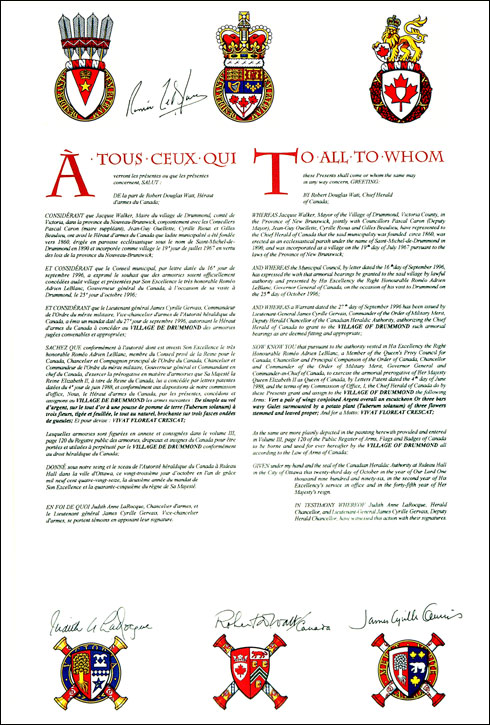 Arms of the Village of DrummondBlazonVert a pair of wings conjoined Argent overall an escutcheon Or three bars wavy Gules surmounted by a potato plant (Tuberum solanum) of three flowers stemmed and leaved proper; SymbolismThe colour green represents the richness of the land, the economic base of the municipality. The wings refer to the parish’s patron saint, the Archangel Michael. The municipality’s name is represented by the small shield depicting the arms associated with the Drummond family from Scotland. The potato plant symbolizes the principal resource of the municipality. |
