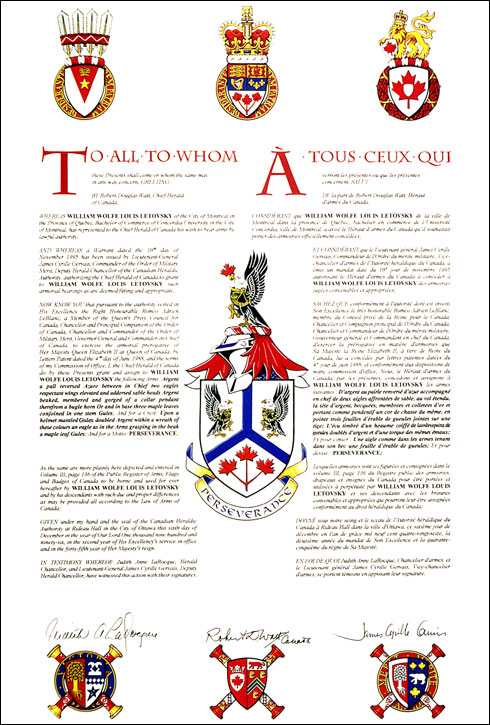 Additional InformationCreator(s)Original concept of William Wolfe Louis Letovsky and Leopold Kurcz, assisted by the heralds of the Canadian Heraldic Authority. PainterRobert Grey CalligrapherNot applicable Recipient TypeIndividual |