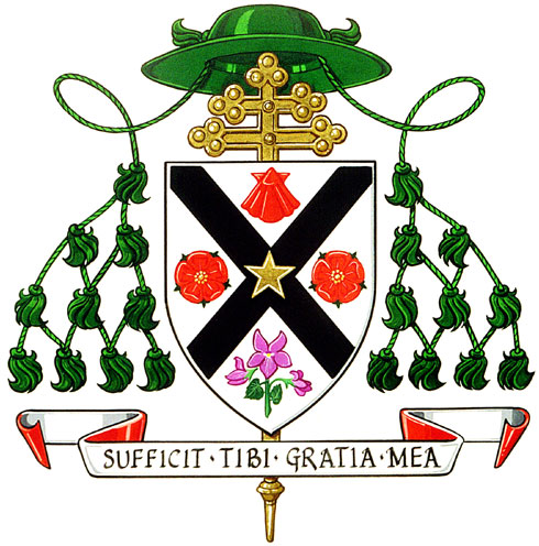 Arms of Ernest LégerBlazonArgent a saltire Sable charged in centre point with a mullet Or between in chief a scallop Gules in dexter and sinister flanks a rose Gules seeded Or barbed Vert and in base a sprig of violets (Viola cuculata) stemmed and leaved proper; SymbolismThe saltire, relating to the cross of Saint Andrew, is a frequent symbol in the arms of the Johnson families. Here, Archbishop Léger uses it to pay homage to his mother and to his uncle, the late Father Camille Johnson, who was a priest at the Cathedral in Moncton. The star is a Marian symbol referring to the Maris Stella, the star of the sea, which is associated with the Virgin of the Assumption, patron saint of Archbishop Léger’s archdiocese and of Acadia. The shell in the arms recalls both the Mi’kmaqs of New-Brunswick and the birthplace of the Archbishop, Cormier Village, in the Parish of Haute-Aboujagane in New Brunswick The parish’s name was given in 1812 as Naboujagan by Monseigneur Plessis, Archbishop of Quebec, and it seems to have been a misnomer for Naposang, Mi’kmaq for “the rope is covered with shells”. The rose, another Marian emblem, recalls the first ancestor in Archbishop Léger’s paternal line, Jacques Léger dit La Rosette. The violet, likewise a Marian emblem, is the floral emblem of New Brunswick, the province where the Archdiocese of Moncton is located. |