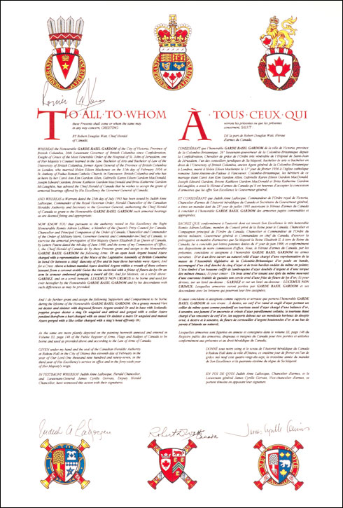 Additional InformationCreator(s)Original concept of Robert D. Watt, Chief Herald of Canada, assisted by the heralds of the Canadian Heraldic Authority. PainterJoan Bouwmeester CalligrapherJoan Bouwmeester Recipient TypeIndividual Special DesignationLieutenant Governor |