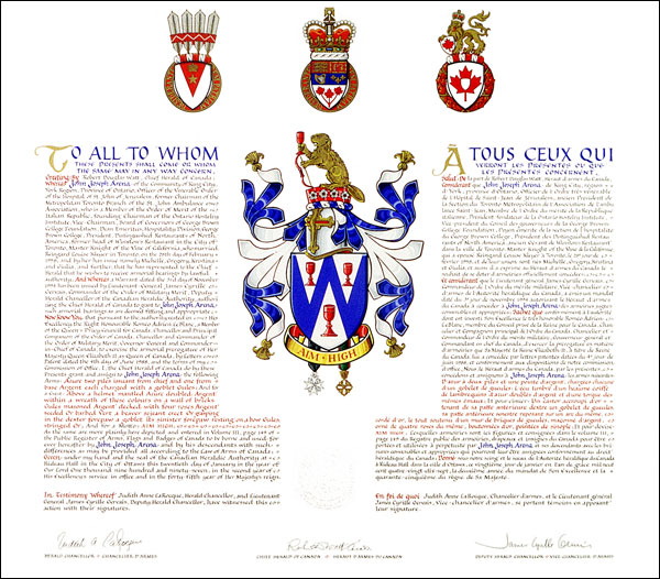 Additional InformationCreator(s)Original concept of Robert D. Watt, Chief Herald of Canada, assisted by the heralds of the Canadian Heraldic Authority. PainterGordon Macpherson CalligrapherNancy Ellis Recipient TypeIndividual |