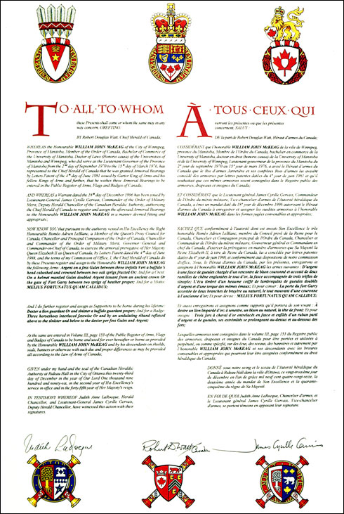Additional InformationCreator(s)Not available PainterArtist of the College of Arms, London / Artiste du Collège d’armes, Londres CalligrapherNot applicable Recipient TypeIndividual Special DesignationLieutenant Governor Other InformationThe recipient’s emblems were originally recorded in the records of the College of Arms, London, England, 4 June 1981. |