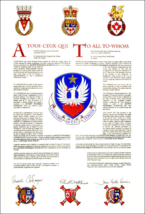 Additional InformationCreator(s)Original concept of Robert Pichette, Dauphin Herald Extraordinary, assisted by the heralds of the Canadian Heraldic Authority. PainterLinda Nicholson CalligrapherNot applicable Recipient TypeCivil Institution
