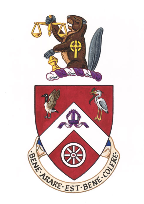 CrestBlazonA demi beaver proper charged with a Celtic cross holding in the dexter paw a pair of scales and resting the sinister paw on a ciborium all or; |