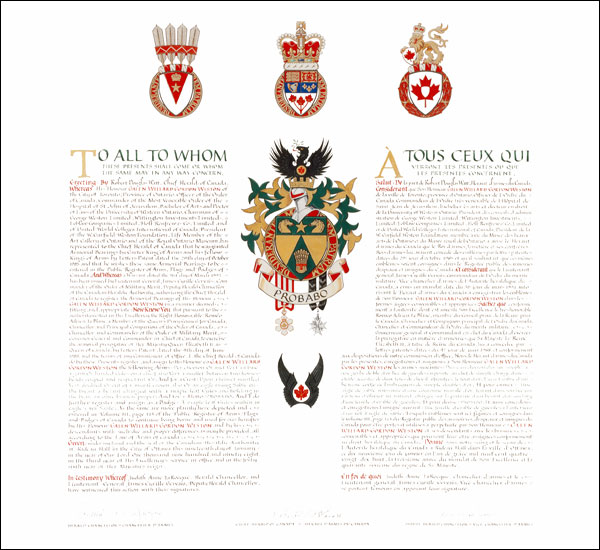 CrestBlazonOut of a mural crown Or an eagle rising Sable on the breast a bezant charged with a maple leaf Gules and holding in the beak an olive branch proper; SymbolismThe eagle is an emblem associated with the Weston family. The maple leaf upon the eagle’s breast is for Canada. The stone tower signifies Mr. Weston’s many involvements with property. |