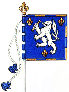 Arms of Jacques DuchesneauBlazonAzure between three fleurs-de-lys Or a lion rampant Argent holding in the dexter paw a baton of command Or; |