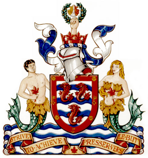 SupportersBlazonOn a compartment barry wavy Azure and Argent dexter a merman sinister a mermaid both proper and queued Vert each holding a maple leaf Gules; |