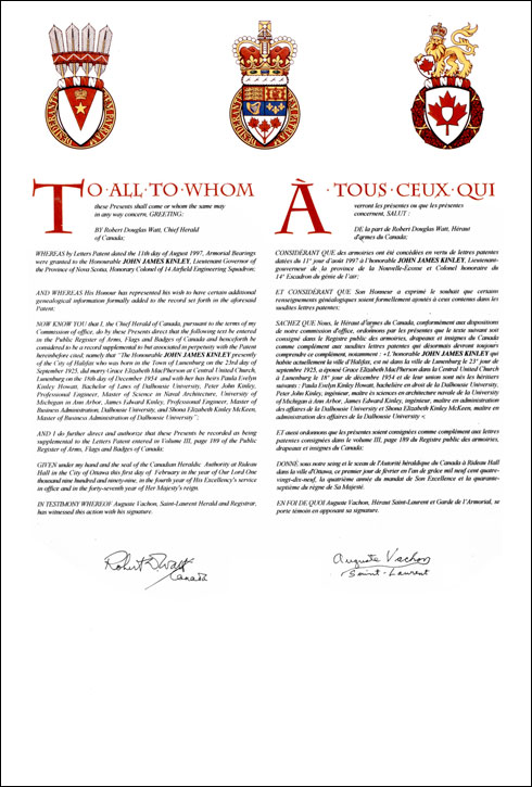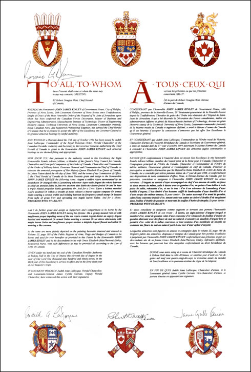 Additional InformationCreator(s)Original concept of Robert D. Watt, Chief Herald of Canada, assisted by the heralds of the Canadian Heraldic Authority. PainterDebra MacGarvie CalligrapherNancy Ellis Recipient TypeIndividual Special DesignationLieutenant Governor |