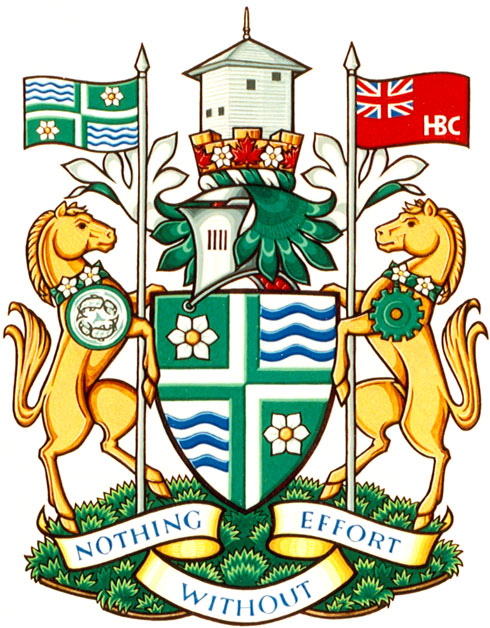 SupportersBlazonOn a grassy mound Vert dexter a mare Or gorged with a collar of strawberry plants flowered proper pendant therefrom a plate fimbriated Vert and charged with two Salish salmon in orle as represented by Brandon Gabriel sinister a stallion Or gorged with a like collar pendant therefrom a cogwheel Vert each supporter holding between the forelegs a staff Argent flying therefrom dexter a banner of the Arms sinister the ensign of the Hudson's Bay Company; |