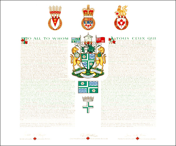 Additional InformationCreator(s)Original concept of Robert D. Watt, Chief Herald of Canada, assisted by the heralds of the Canadian Heraldic Authority. PainterJoan Bouwmeester CalligrapherJoan Bouwmeester Recipient TypeCivil Institution