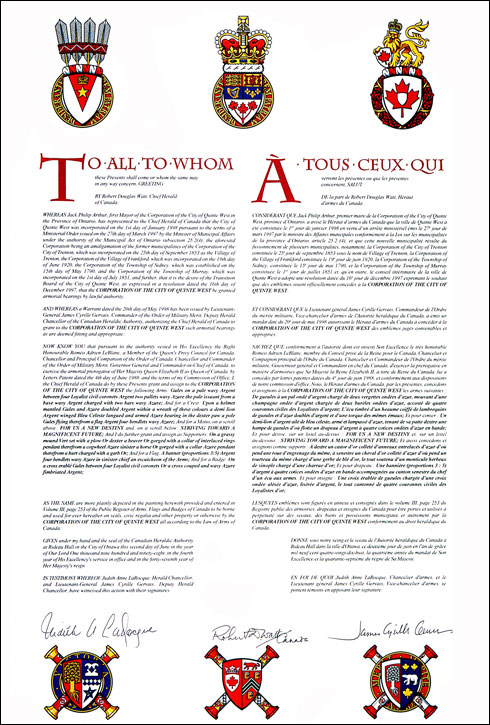 Additional InformationCreator(s)Original concept of Robert D. Watt, Chief Herald of Canada, assisted by the heralds of the Canadian Heraldic Authority. PainterJoan Bouwmeester CalligrapherJoan Bouwmeester Recipient TypeCivil Institution