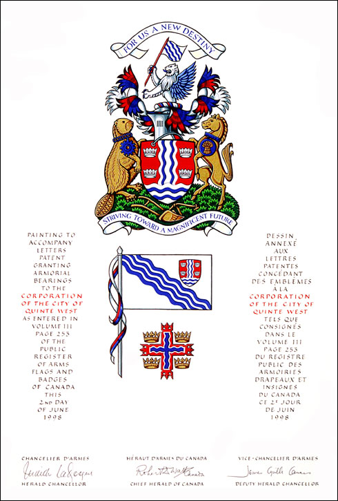 Arms of the Corporation of the City of Quinte WestBlazonGules on a pale wavy Argent between four Loyalist civil coronets Argent two pallets wavy Azure the pale issuant from a base wavy Argent charged with two bars wavy Azure; |