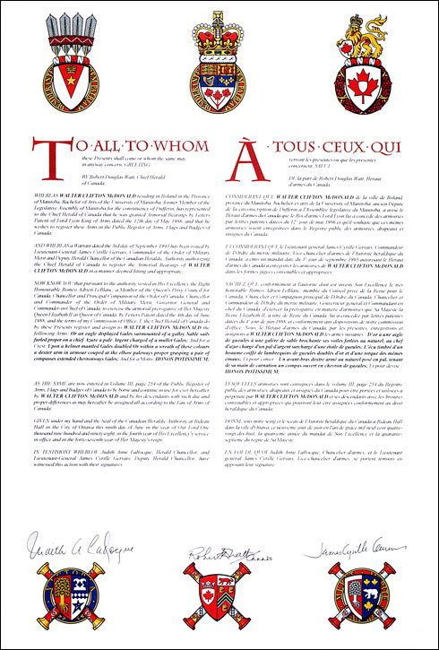 Additional InformationCreator(s)Not available PainterCourt of the Lord Lyon, Edinburgh / Cour du roi d’armes Lord Lyon, Édimbourg CalligrapherNot applicable Recipient TypeIndividual Other InformationThe recipient’s emblems were originally recorded in the records of the Court of the Lord Lyon, Edinburgh, Scotland, 12 May 1986. |