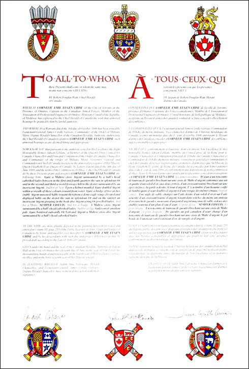 The contents of this Register are intended for research purposes only. The heraldic emblems found in the Register may not be reproduced in any form or in any media without the written consent of the Canadian Heraldic Authority and/or the recipient.