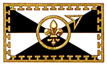 Arms of the Ville de FermontBlazonPer fess gyronny of six Argent and Sable within the sign of Mars its arrowhead voided a fleur-de-lis Or; |
