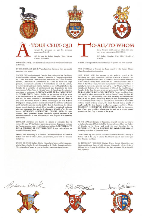 Additional InformationCreator(s)Original concept of Claire Boudreau, Saint-Laurent Herald, and Karine Constantineau, Assistant Herald, assisted by the Heralds of the Canadian Heraldic Authority PainterIlona Jurkiewicz CalligrapherSuzzann Wright Recipient TypeCivil Institution