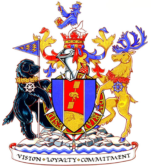 SupportersBlazonOn rocks proper rising above barry wavy Argent and Azure dexter a Newfoundland dog Sable gorged with a collar of pitcher plant flowers Or pendant therefrom a ship's wheel Argent supporting a staff Argent flying therefrom a pennant Azure charged with three lightning flashes in fess Or sinister a caribou also Or unguled and attired Azure gorged with a collar of pitcher plant flowers Gules pendant therefrom a ship's wheel Azure; |