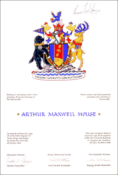 Arms of Arthur Maxwell HouseBlazonAzure on a Canadian pale Gules fimbriated Argent a communications satellite above an arc of the globe showing Newfoundland all Or; |