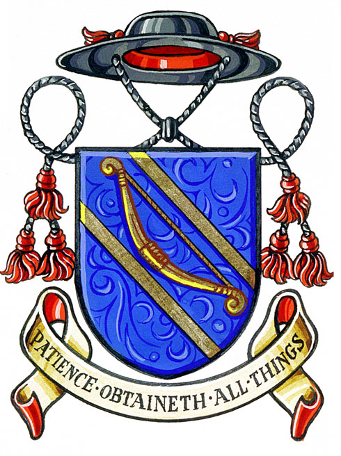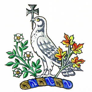 Crest of David George BowyerBlazonAn Osprey (Pandion haliaetus carolinensis) proper statant its dexter claw on a rose branch proper the roses Argent barbed and seeded also proper its sinister claw upon a branch of maple in its autumnal tints proper and holding in the beak a cross formy fitchy Sable; |