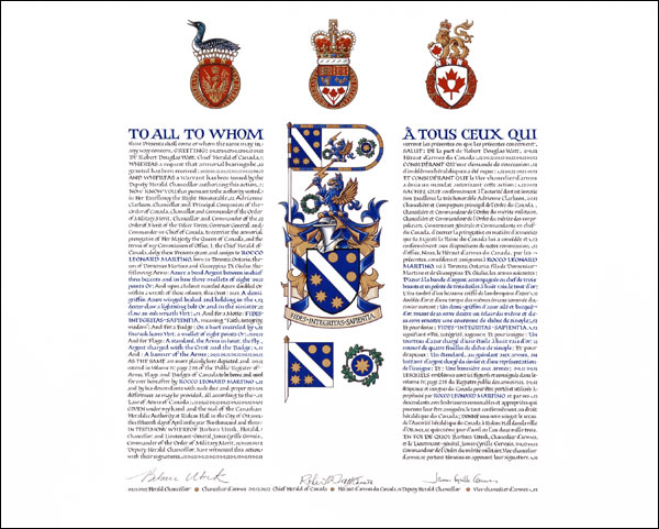 CrestBlazonA demi griffin Azure winged beaked and holding in the dexter claw a lightning bolt Or and in the sinister claw an oak wreath Vert; SymbolismThe griffin is a creature that was believed to have guarded treasure, and thus refers to the role of Dr. Martino's business in providing electronic security systems. The lightning bolt is a symbol of communications, and therefore of Dr. Martino's career in the field of computer technology. The oak leaves refer to Dr. Martino's high school, De La Salle College "Oaklands" in Toronto, to the oak tree crest of the University of Toronto, and to the insignia of the Order of St. Gregory the Great, an order of the Holy See to which Dr. Martino belongs. |