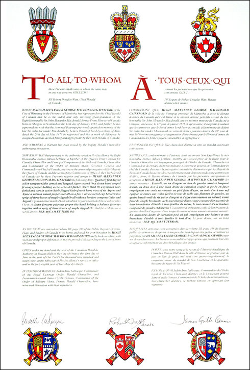 The contents of this Register are intended for research purposes only. The heraldic emblems found in the Register may not be reproduced in any form or in any media without the written consent of the Canadian Heraldic Authority and/or the recipient.