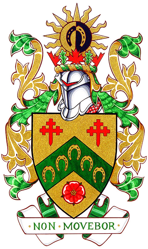 CrestBlazonWithin a circlet composed alternately of maple leaves Gules and oak leaves Vert a sun in splendour Or the centre half eclipsed Sable charged with a horseshoe counterchanged; |