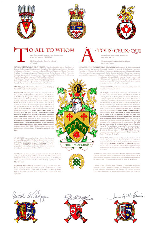 Additional InformationCreator(s)Original concept of John Williamson, assisted by the heralds of the Canadian Heraldic Authority. PainterDebra MacGarvie CalligrapherNot applicable Recipient TypeIndividual |