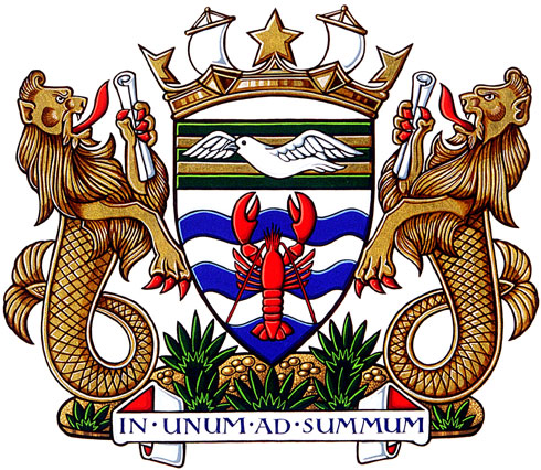 SupportersBlazonOn a compartment with tufts of sea grass and pebbles all proper two sea-lions Or armed and langued Gules each holding in its paw a rolled parchment Argent; |