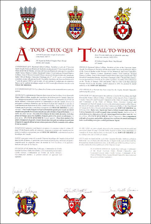 Additional InformationCreator(s)Original concept of Robert Pichette, Dauphin Herald Extraordinary, assisted by the heralds of the Canadian Heraldic Authority. PainterJoan Bouwmeester CalligrapherJoan Bouwmeester Recipient TypeCivil Institution