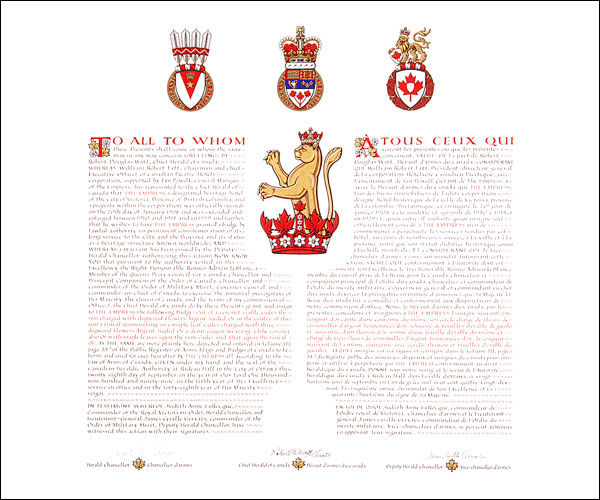 Additional InformationCreator(s)Original concept of Robert D. Watt, Chief Herald of Canada, assisted by the heralds of the Canadian Heraldic Authority. PainterJoan Bouwmeester CalligrapherJoan Bouwmeester Recipient TypeCivil Institution |