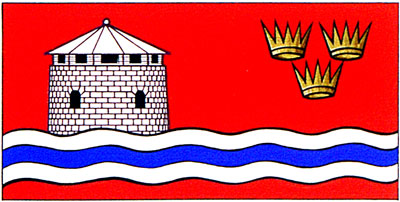Flag of the Corporation of the City of KingstonBlazonA banner Gules charged in base barry wavy of three Argent Azure and Argent set thereon dexter a Martello tower Argent in sinister chief three Eastern crowns two and one Or; SymbolismThe symbolism of this emblem is found in other element(s) of this record. |