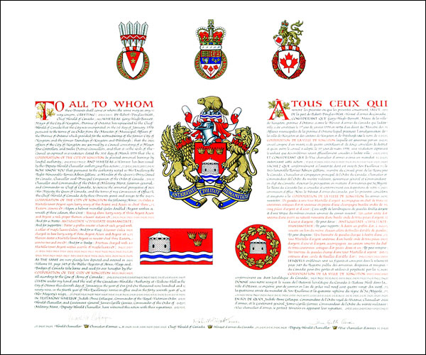 Additional InformationCreator(s)Original concept of the Ad Hoc Committee for Kingston's New Coat of Arms, assisted by the heralds of the Canadian Heraldic Authority. PainterEva Pilar-Cass CalligrapherSuzzann Wright Recipient TypeCivil Institution