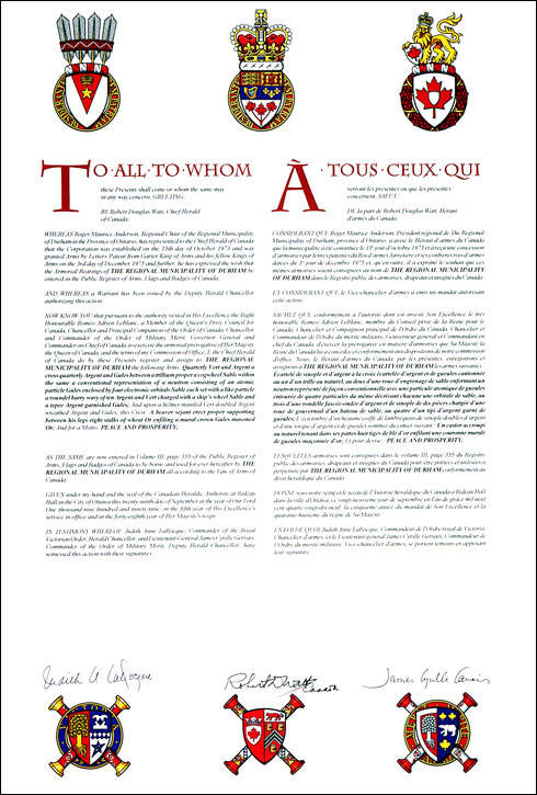 Arms of The Regional Municipality of DurhamBlazonQuarterly Vert and Argent a cross quarterly Argent and Gules between a trillium proper a cogwheel Sable within the same a conventional representation of a neutron consisting of an atomic particle Gules enclosed by four electronic orbitals Sable each set with a like particle a roundel barry wavy of ten Argent and Vert charged with a ship’s wheel Sable and a tepee Argent garnished Gules; |