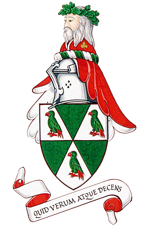 CrestBlazonA Druid's head in profile wreathed with a chaplet of oak leaves proper vested Gules charged with a trefoil slipped Or; |