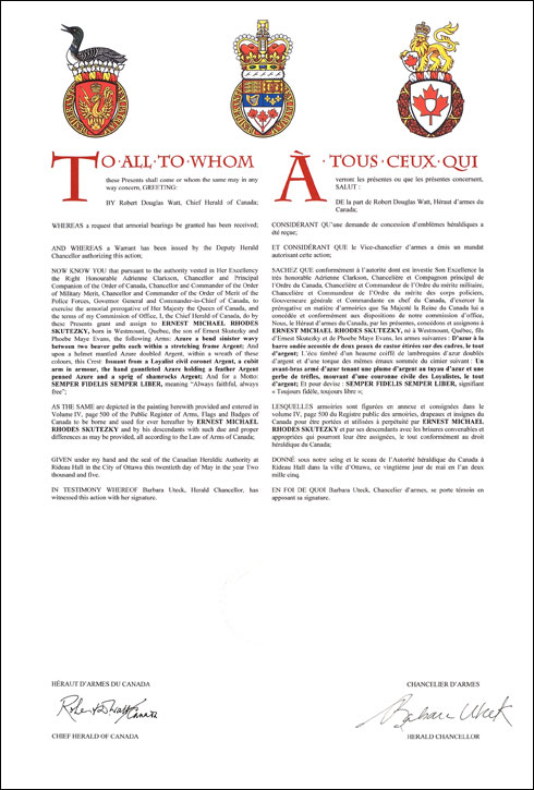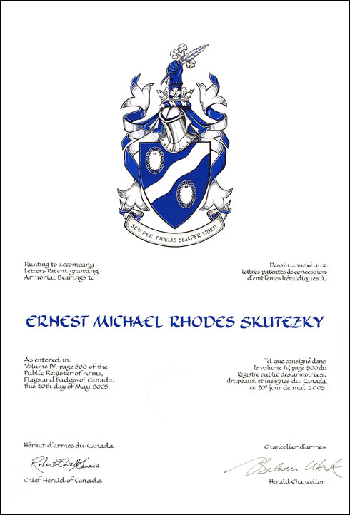 Arms of Ernest Michael Rhodes SkutezkyBlazonAzure a bend sinister wavy between two beaver pelts each within a stretching frame Argent; SymbolismThe blue and white have been used in Mr. Skutezky’s family in Austria, and they are also the colours of Quebec, where he grew up, as well as Scotland, the home of many of his ancestors. The white wavy stripe makes an allusion to the St. Lawrence River, flowing northeast into the Atlantic. It can also indicate the Danube River and thus his Austrian heritage. The beaver pelts represent his ancestors who were wintering partners of the North West Company. |