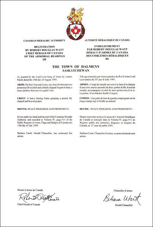 Letters Patent registering the Arms of The Town of DalmenyBlazonPer fess Vert and Azure, on a fess Or between two primroses Or in chief and a thistle slipped Argent in base, a cross anchory between two garbs Vert; SymbolismNot applicable |