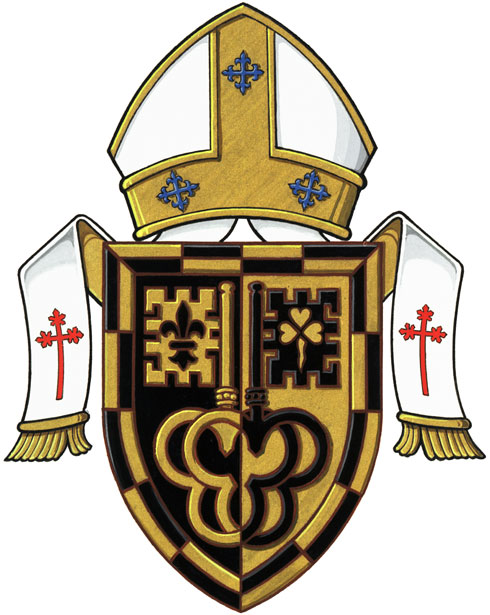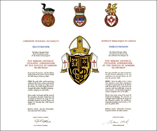 Arms of The Roman Catholic Episcopal Corporation of the Diocese of London in OntarioBlazonPer pale Sable and Or two keys addorsed the bows in base interlaced the dexter bit voided of a fleur de lis the sinister of a trefoil slipped counterchanged all within a bordure compony-counter-compony Or and Sable; SymbolismNot applicable |